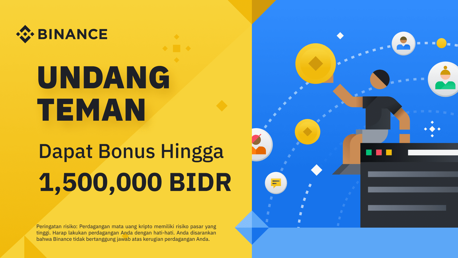 Kampanye standar referral spesial kami hadirkan di bulan November! Ajak teman, keluarga atau komunitasmu untuk gabung dengan Binance dan kamu berkesempatan untuk memenangkan total hadiah sebesar 100 Juta BIDR.